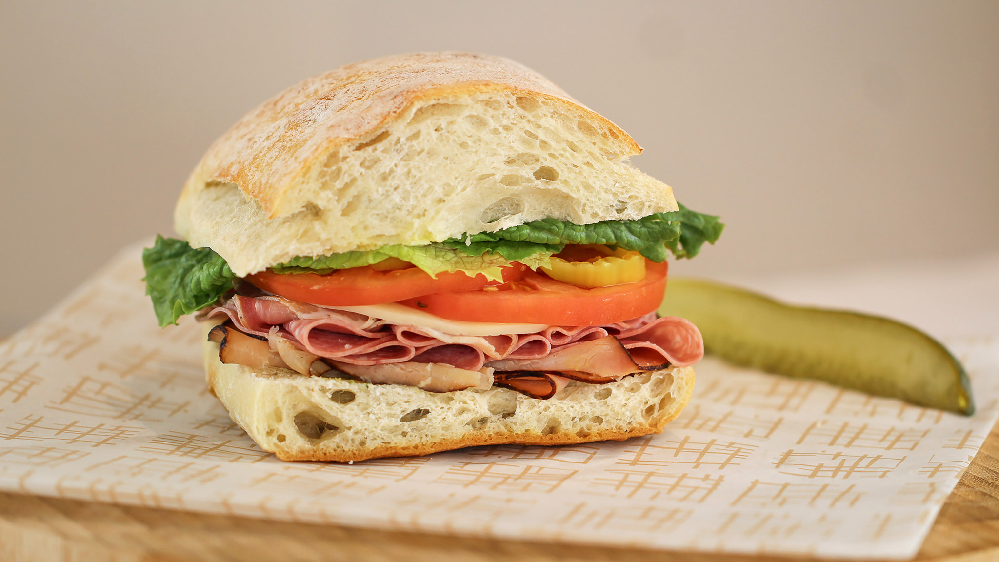Shaved ham, prosciutto, genoa salami, provolone cheese, lettuce, tomato, mild banana peppers & basil pesto aioli, served on Italian ciabatta